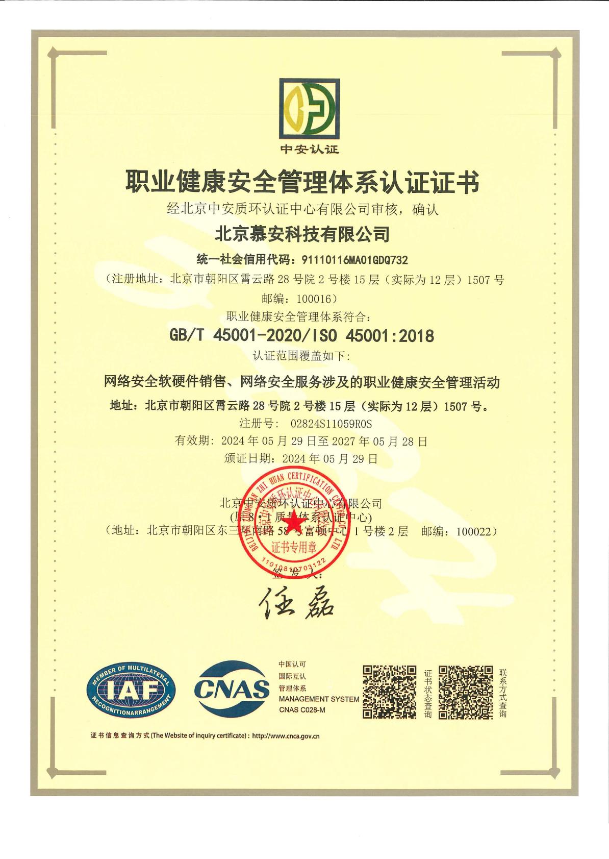 iso45001 北京慕安科技有限公司-电子证书中文
